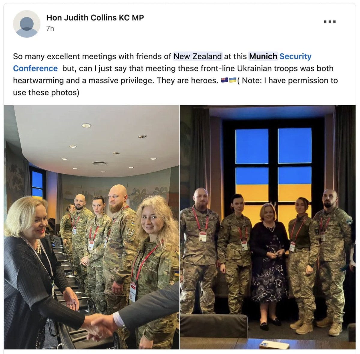Judith Collins in audience during Rubio’s speech as seen in video. And then posted about meeting with Ukrainians to continue in support of NATO war efforts...